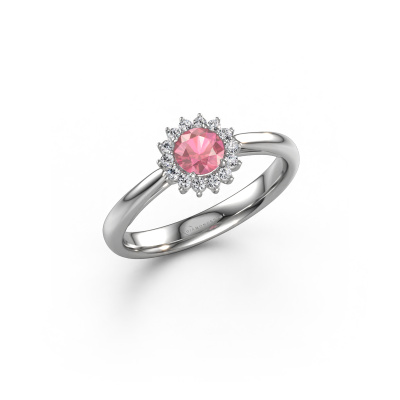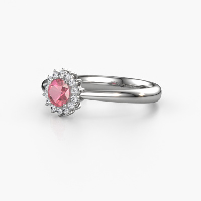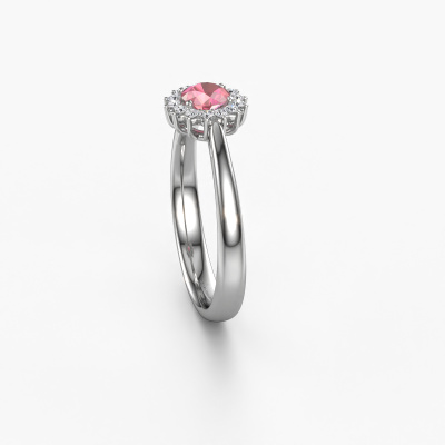 The ring shown above is called the Tilly RND 1. We call this type of ring a cluster ring. The centre gemstone is surrounded by smaller sized stones. This 14 Carat white gold version is set with a 4.2 mm round tourmaline pink centre stone, embraced by smaller diamonds. What makes this classic white gold cluster ring special is the setting of the smaller gems surrounding the centre tourmaline pink, which are shaped like a beautiful flower. The surrounding cluster of stones frame the middle centre stone in such a way to make it appear bigger. This type of engagement ring is also called a flower ring. It is very important that the smaller diamonds are positioned identically so there is no interference of light but perfect unity instead. Our skilled Goldsmiths get the job done. Each individual stone is carefully set by hand. During manufacturing, light fall is constantly monitored to make sure the special cluster effect is still visible. In the end you get the perfect engagement ring with a radiant tourmaline pink gemstone centrepiece. You can imagine the effect of a ring of such significance when you give tot the love of your life on her special day to shine. This jewel is made to shine bright around your finger. Each jewel is hand made with love by our goldsmiths.By using a combination of the latest modern techniques, combined with ancient crafting, we can make all our engagement rings in our own studio. Each jewel is made to order. This is advantageous because we can offer you a price you won't find anywhere else.Our team adds new designs to our online collection daily. Our designers and goldsmiths work together in creating the best design. We strive to offer a diverse collection of jewels. Perhaps you have a specific jewel design in mind. One you came across somewhere. Please contact us for a free consultation. We will make you an offer, based on a fair price/ quality ratio, that will baffle you.To make it easier for you, we offer a 30 day return policy. Check our terms and conditions.