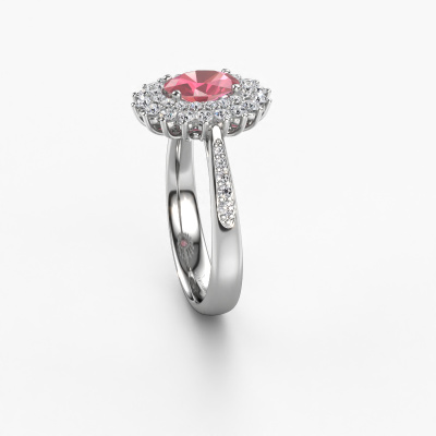 The ring shown above is called the Alina 2. We call this type of ring a cluster ring. The centre gemstone is surrounded by smaller sized stones. This 14 Carat white gold version is set with a 7x5 mm oval tourmaline pink centre stone, embraced by smaller diamonds. What makes this exclusive white gold cluster ring special is the setting of the smaller gems surrounding the centre tourmaline pink, which are shaped like a beautiful flower. The surrounding cluster of stones frame the middle centre stone in such a way to make it appear bigger. This type of engagement ring is also called a flower ring. It is very important that the smaller diamonds are positioned identically so there is no interference of light but perfect unity instead. Our skilled Goldsmiths get the job done. Each individual stone is carefully set by hand. During manufacturing, light fall is constantly monitored to make sure the special cluster effect is still visible. In the end you get the perfect engagement ring with a radiant tourmaline pink gemstone centrepiece. You can imagine the effect of a ring of such significance when you give tot the love of your life on her special day to shine. This jewel is made just for you, with attention to detail and design.By using a combination of the latest modern techniques, combined with ancient crafting, we can make all our engagement rings in our own studio. Each jewel is made to order. This is advantageous because we can offer you a price you won't find anywhere else.Have you found a specific engagement ring somewhere which you would like to give to your loved one? Please feel free to express your wishes to our jewel designers because we would be honoured to turn your design into a exclusive engagement ring. You can follow the development of your ring design because we use 3D drawings. This gives you a realistic preview of how your design will look. You can also preorder a dummy. A dummy is a plastic ring, which can be shaped according your ring design. You can try it on and check if its width and size are suitable for you. We will gladly send you a non-binding offer, based on a fair price/ quality ratio. It will amaze you, considering the quality of the ring and gemstones.To make it easier for you, we offer a 30 day return policy. Check our terms and conditions.