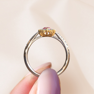 The ring shown above is called the Tilly per 2. We call this type of ring a cluster ring. The centre gemstone is surrounded by smaller sized stones. This 14 Carat white gold version is set with a 6x4 mm pear tourmaline pink centre stone, embraced by smaller diamonds. What makes this exclusive white gold cluster ring special is the setting of the smaller gems surrounding the centre tourmaline pink, which are shaped like a beautiful flower. The surrounding cluster of stones frame the middle centre stone in such a way to make it appear bigger. This type of engagement ring is also called a flower ring. It is very important that the smaller diamonds are positioned identically so there is no interference of light but perfect unity instead. Our skilled Goldsmiths get the job done. Each individual stone is carefully set by hand. During manufacturing, light fall is constantly monitored to make sure the special cluster effect is still visible. In the end you get the perfect engagement ring with a radiant tourmaline pink gemstone centrepiece. You can imagine the effect of a ring of such significance when you give tot the love of your life on her special day to shine. This jewel is made just for you, with attention to detail and design.After receiving your order, our goldsmiths will passionately start the creative process of making your engagement ring in our own studio. Because we don't have a big stockpile, these costs will not be passed on to you. Our pricing is proof of that! We offer top quality jewels at lowest price, guaranteed.Different styles of new rings are made daily by our team. Perhaps you have found a cluster engagement ring somewhere. One you would like to give to your loved one. Please feel free to share your thoughts and design with our jewel designers. We would love to turn your design into a exclusive engagement ring. You can follow the development of your ring design because we use very detailed 3D drawings. On top of that, you can order a dummy of the design. A dummy is a plastic ring, which can be shaped according your ring design. You can try it on and check if the engagement ring is up to standard. We will gladly send you a non-binding offer, based on a fair price/ quality ratio. The offer will baffle you, considering the quality of the ring and gemstones.To make it easier for you, we offer a 30 day return policy. Check our terms and conditions.