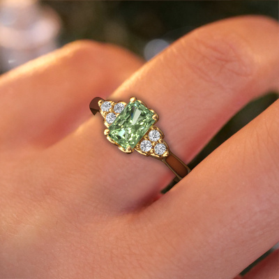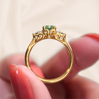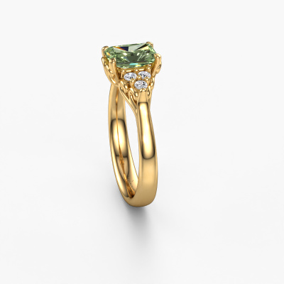 This 14 Carat gold ring is called Myrna RAD and is set with 7x5 mm green lab grown diamond. Are you looking for a contemporary gold engagement ring which you can customize to your own liking? This contemporary engagement ring is set with green lab grown diamond which is carefully selected for this specific ring in order to create the best effect. Our expert goldsmith will create your ring in our own crafting studio, where the green lab grown diamond will be set with great care. The ring will then be polished till it shines perfectly. Nothing but the best for the love of your life! The great thing about our online tool is, that you can compile your own jewellery into a unique, personalized piece. Each piece of jewellery is made with passion and love by one of our master goldsmiths.Are you on a budget? Please feel free to contact us, so we can go discuss your options. We offer our engagement rings at guaranteed best price, because we make them to order. You won't find such a price anywhere else!Have you found a specific engagement ring somewhere which you would like to give to your loved one? Please feel free to express your wishes to our jewel designers because we would be honoured to turn your design into a contemporary engagement ring. You can follow the development of your ring design because we use 3D drawings. This gives you a realistic preview of how your design will look. You can also preorder a dummy. A dummy is a plastic ring, which can be shaped according your ring design. You can try it on and check if its width and size are suitable for you. We will gladly send you a non-binding offer, based on a fair price/ quality ratio. It will amaze you, considering the quality of the ring and gemstones.To make it easier for you, we offer a 30 day return policy. Check our terms and conditions.