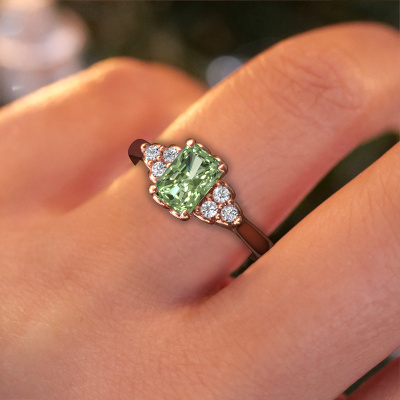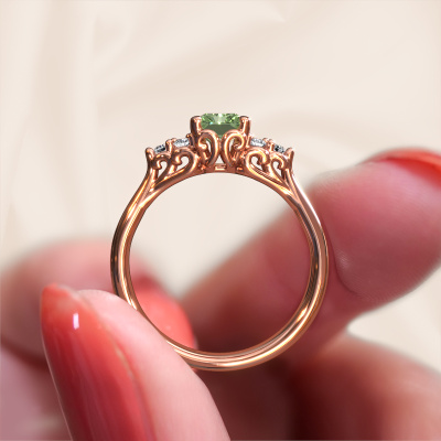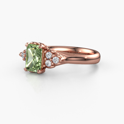 This 14 Carat rose gold ring is called Myrna RAD and is set with 7x5 mm green lab grown diamond. Are you looking for a contemporary rose gold engagement ring which you can customize to your own liking? This contemporary engagement ring is set with green lab grown diamond which is carefully selected for this specific ring in order to create the best effect. Our expert goldsmith will create your ring in our own crafting studio, where the green lab grown diamond will be set with great care. The ring will then be polished till it shines perfectly. Nothing but the best for the love of your life! The great thing about our online tool is, that you can compile your own jewellery into a unique, personalized piece. Each piece of jewellery is made with passion and love by one of our master goldsmiths.Are you on a budget? Please feel free to contact us, so we can go discuss your options. We offer our engagement rings at guaranteed best price, because we make them to order. You won't find such a price anywhere else!Have you found a specific engagement ring somewhere which you would like to give to your loved one? Please feel free to express your wishes to our jewel designers because we would be honoured to turn your design into a contemporary engagement ring. You can follow the development of your ring design because we use 3D drawings. This gives you a realistic preview of how your design will look. You can also preorder a dummy. A dummy is a plastic ring, which can be shaped according your ring design. You can try it on and check if its width and size are suitable for you. We will gladly send you a non-binding offer, based on a fair price/ quality ratio. It will amaze you, considering the quality of the ring and gemstones.To make it easier for you, we offer a 30 day return policy. Check our terms and conditions.