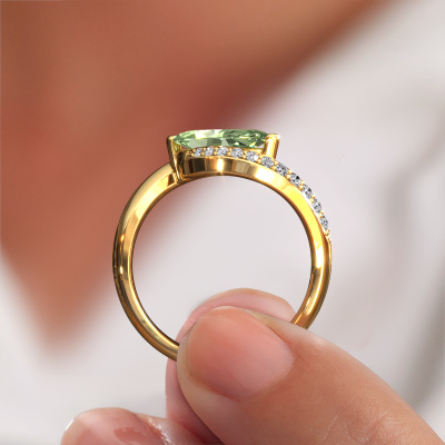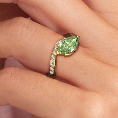 This 14 Carat gold ring is called Aida MRQ side and is set with 11x5.5 mm green lab grown diamond. Are you looking for a design gold engagement ring which you can customize to your own liking? This design engagement ring is set with green lab grown diamond which is carefully selected for this specific ring in order to create the best effect. Our expert goldsmith will create your ring in our own crafting studio, where the green lab grown diamond will be set with great care. The ring will then be polished till it shines perfectly. Nothing but the best for the love of your life! The great thing about our online tool is, that you can compile your own jewellery into a unique, personalized piece. Each piece of jewellery is made with passion and love by one of our master goldsmiths.Are you on a budget? Please feel free to contact us, so we can go discuss your options. We offer our engagement rings at guaranteed best price, because we make them to order. You won't find such a price anywhere else!Our team adds new designs to our online collection daily. Our designers and goldsmiths work together in creating the best design. We strive to offer a diverse collection of jewels. Perhaps you have a specific jewel design in mind. One you came across somewhere. Please contact us for a free consultation. We will make you an offer, based on a fair price/ quality ratio, that will baffle you.To make it easier for you, we offer a 30 day return policy. Check our terms and conditions.