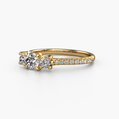 This 14 Carat gold ring is called Jesica and is set with 0.78 crt diamond. What is it that makes your relationship unique? What is it about her that makes you want to bend down on one knee? The unique bond between the two of you is emphasized by an equally unique ring. A one of a kind graceful 3-stone engagement ring made especially for her. That is why this classic ring fits her like a glove. Each specific detail of this graceful gold diamond set engagement ring is hand-picked, crafted and polished by our expert goldsmith. The result is an exquisite ring, unique and perfectly crafted to perfection. That is what our expert Goldsmiths strive for. This jewel is made just for you, with attention to detail and design.After receiving your order, our goldsmiths will passionately start the creative process of making your engagement ring in our own studio. Because we don't have a big stockpile, these costs will not be passed on to you. Our pricing is proof of that! We offer top quality jewels at lowest price, guaranteed.Different styles of new rings are made daily by our team. Perhaps you have found a 3-stone engagement ring somewhere. One you would like to give to your loved one. Please feel free to share your thoughts and design with our jewel designers. We would love to turn your design into a classic engagement ring. You can follow the development of your ring design because we use very detailed 3D drawings. On top of that, you can order a dummy of the design. A dummy is a plastic ring, which can be shaped according your ring design. You can try it on and check if the engagement ring is up to standard. We will gladly send you a non-binding offer, based on a fair price/ quality ratio. The offer will baffle you, considering the quality of the ring and gemstones.To make it easier for you, we offer a 30 day return policy. Check our terms and conditions.