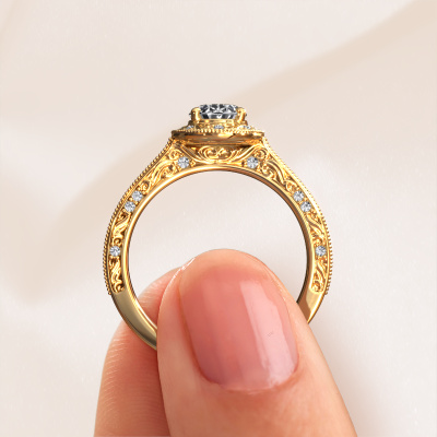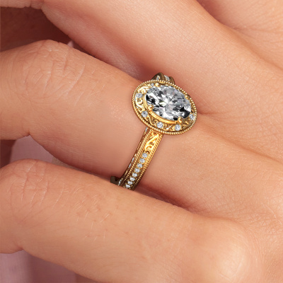 This 14 Carat gold ring is called Alice OVL and is set with 1.003 crt diamond. What is it that makes your relationship unique? What is it about her that makes you want to bend down on one knee? The unique bond between the two of you is emphasized by an equally unique ring. A one of a kind filigree halo engagement ring made especially for her. That is why this vintage ring fits her like a glove. Each specific detail of this filigree gold diamond set engagement ring is hand-picked, crafted and polished by our expert goldsmith. The result is an exquisite ring, unique and perfectly crafted to perfection. That is what our expert Goldsmiths strive for. This jewel is made with passion and love by one of our master goldsmiths.By using our modern techniques, we can design and customize the finest quality jewels with the utmost care for you. Our engagement rings are always priced 30 percent lower than other jewellers. We make engagement rings to order so we don't have to maintain a large stock. If you have a certain budget, we are more than happy to advice you accordingly.Our team adds new designs to our online collection daily. Our designers and goldsmiths work together in creating the best design. We strive to offer a diverse collection of jewels. Perhaps you have a specific jewel design in mind. One you came across somewhere. Please contact us for a free consultation. We will make you an offer, based on a fair price/ quality ratio, that will baffle you.To make it easier for you, we offer a 30 day return policy. Check our terms and conditions.