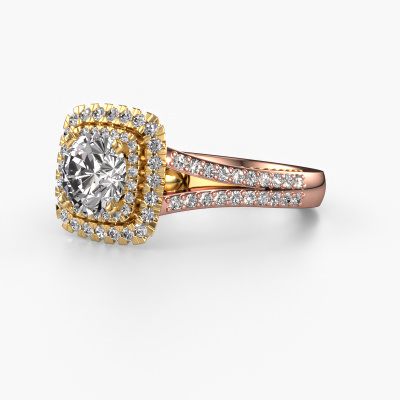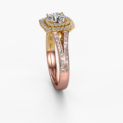 The ring shown above is called the Annette. We call this type of ring a halo ring because it has one centre gemstone and a band that is also pave set with gemstones. The 14 Carat rose gold engagement ring is set with a round 1.00 crt diamond centre stone and the band is pave set with diamond gemstones. Each jewel is made just for you by our master goldsmiths in our own studio.This vintage rose gold halo engagement ring has an exquisite round diamond centre stone. To further accentuate the centre stone, the band is fully set with more diamonds. Its open prong setting allows light to strike the diamond from various angles and this adds sparkle to your diamond ring. The photo shown above depicts the goldsmith's carefully handcrafted details of the ring. The high positioning of the centre stone is truly eye-catching. The perfect engagement ring for the crown jewel of your life! After receiving your order, our goldsmiths will passionately start the creative process of making your engagement ring in our own studio. Because we don't have a big stockpile, these costs will not be passed on to you. Our pricing is proof of that! We offer top quality jewels at lowest price, guaranteed.Have you found a specific engagement ring somewhere which you would like to give to your loved one? Please feel free to express your wishes to our jewel designers because we would be honoured to turn your design into a vintage engagement ring. You can follow the development of your ring design because we use 3D drawings. This gives you a realistic preview of how your design will look. You can also preorder a dummy. A dummy is a plastic ring, which can be shaped according your ring design. You can try it on and check if its width and size are suitable for you. We will gladly send you a non-binding offer, based on a fair price/ quality ratio. It will amaze you, considering the quality of the ring and gemstones.To make it easier for you, we offer a 30 day return policy. Check our terms and conditions.