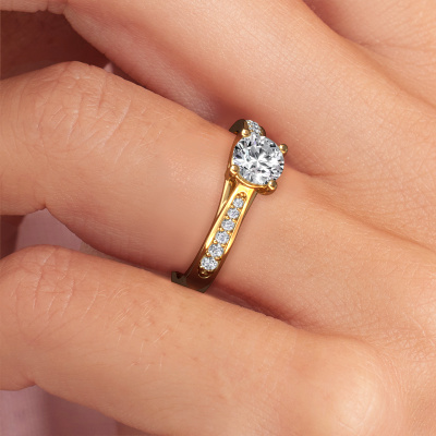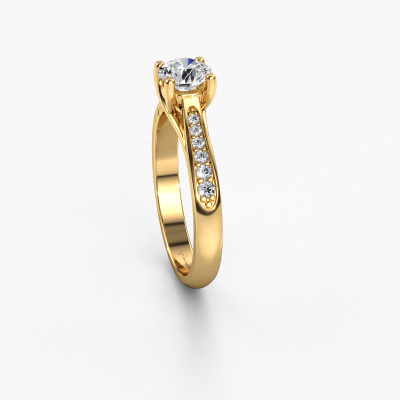 The ring shown above is called the Mia 2. We call this type of ring a pavé solitaire ring because it has one centre gemstone and a band that is also pave set with gemstones. This engagement ring is made in 14 Carat gold set with a 0.70 crt round diamond, and pave set lab-grown diamonds at the sides. Each piece of jewellery is made just for you, with attention to detail and design.This modern gold pavé solitaire engagement ring has an exquisite round diamond centre stone. To further accentuate the centre stone, the band is set full with more lab-grown diamonds. Its open prong setting allows light to strike the diamond from various angles and this adds sparkle to your diamond ring. The photo shown above depicts the goldsmith's carefully handcrafted details of the ring. The high positioning of the centre stone is truly eye-catching. The perfect engagement ring for the crown jewel of your life!By using our modern techniques, we can design and customize the finest quality jewels with the utmost care for you. Our engagement rings are always priced 30 percent lower than other jewellers. We make engagement rings to order so we don't have to maintain a large stock. If you have a certain budget, we are more than happy to advice you accordingly.Different styles of new rings are made daily by our team. Perhaps you have found a pavé solitaire engagement ring somewhere. One you would like to give to your loved one. Please feel free to share your thoughts and design with our jewel designers. We would love to turn your design into a modern engagement ring. You can follow the development of your ring design because we use very detailed 3D drawings. On top of that, you can order a dummy of the design. A dummy is a plastic ring, which can be shaped according your ring design. You can try it on and check if the engagement ring is up to standard. We will gladly send you a non-binding offer, based on a fair price/ quality ratio. The offer will baffle you, considering the quality of the ring and gemstones.To make it easier for you, we offer a 30 day return policy. Check our terms and conditions.