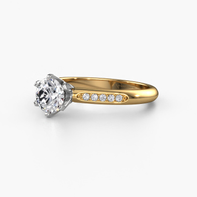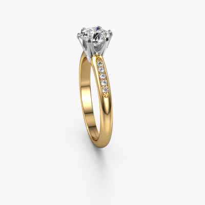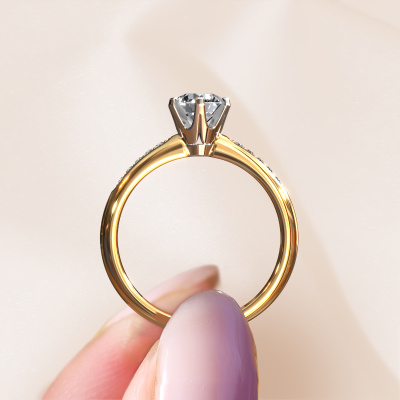 The ring shown above is called the Tiffy 2. We call this type of ring a pavé solitaire ring because it has one centre gemstone and a band that is also pave set with gemstones. This engagement ring is made in 14 Carat gold set with a 0.70 crt round diamond, and pave set diamonds at the sides. Each piece of jewellery is created to add sparkle to your finger, each jewel is lovingly made by hand by our goldsmiths.This traditional gold pavé solitaire engagement ring has an exquisite round diamond centre stone. To further accentuate the centre stone, the band is set full with more diamonds. Its open prong setting allows light to strike the diamond from various angles and this adds sparkle to your diamond ring. The photo shown above depicts the goldsmith's carefully handcrafted details of the ring. The high positioning of the centre stone is truly eye-catching. The perfect engagement ring for the crown jewel of your life!By using our modern techniques, we can design and customize the finest quality jewels with the utmost care for you. Our engagement rings are always priced 30 percent lower than other jewellers. We make engagement rings to order so we don't have to maintain a large stock. If you have a certain budget, we are more than happy to advice you accordingly.Our designers and goldsmiths work together each day, creating new jewels. Perhaps you have found a nice traditional engagement ring somewhere, which can be used to customize your unique ring. Please feel free to contact us. We will make you an offer, based on a fair price/ quality ratio, which will amaze you.To make it easier for you, we offer a 30 day return policy. Check our terms and conditions.