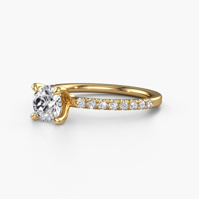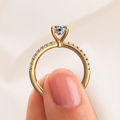 The ring shown above is called the Crystal RND 2. We call this type of ring a pavé solitaire ring because it has one centre gemstone and a band that is also pave set with gemstones. The 14 Carat gold engagement ring is set with a round 0.70 crt diamond centre stone and the band is pave set with lab grown diamond gemstones. Each jewel is unique in every way! Simply customize to your liking,This classic gold pavé solitaire engagement ring has an exquisite round diamond centre stone. To further accentuate the centre stone, the band is fully set with more lab-grown diamonds. Its open prong setting allows light to strike the diamond from various angles and this adds sparkle to your diamond ring. The photo shown above depicts the goldsmith's carefully handcrafted details of the ring. The high positioning of the centre stone is truly eye-catching. The perfect engagement ring for the crown jewel of your life! After receiving your order, our goldsmiths will start the creative process of making your Crystal RND 2 engagement ring. We don't keep stock. This is advantageous because these costs will not be passed on to you. Therefore, we can offer jewellery at exceptionally low prices.Different styles of new rings are made daily by our team. Perhaps you have found a pavé solitaire engagement ring somewhere. One you would like to give to your loved one. Please feel free to share your thoughts and design with our jewel designers. We would love to turn your design into a classic engagement ring. You can follow the development of your ring design because we use very detailed 3D drawings. On top of that, you can order a dummy of the design. A dummy is a plastic ring, which can be shaped according your ring design. You can try it on and check if the engagement ring is up to standard. We will gladly send you a non-binding offer, based on a fair price/ quality ratio. The offer will baffle you, considering the quality of the ring and gemstones.To make it easier for you, we offer a 30 day return policy. Check our terms and conditions.