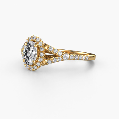 The ring shown above is called the Kimber OVL. We call this type of ring a pavé solitaire ring because it has one centre gemstone and a band that is also pave set with gemstones. The 14 Carat gold engagement ring is set with a oval 0.60 crt diamond centre stone and the band is pave set with lab grown diamond gemstones. Each jewel is made with passion and love by one of our master goldsmiths.This exclusive gold pavé solitaire engagement ring has an exquisite oval diamond centre stone. To further accentuate the centre stone, the band is fully set with more lab-grown diamonds. Its open prong setting allows light to strike the diamond from various angles and this adds sparkle to your diamond ring. The photo shown above depicts the goldsmith's carefully handcrafted details of the ring. The high positioning of the centre stone is truly eye-catching. The perfect engagement ring for the crown jewel of your life! By using a combination of the latest modern techniques, combined with ancient crafting, we can make all our engagement rings in our own studio. Each jewel is made to order. This is advantageous because we can offer you a price you won't find anywhere else.Our team adds new designs to our online collection daily. Our designers and goldsmiths work together in creating the best design. We strive to offer a diverse collection of jewels. Perhaps you have a specific jewel design in mind. One you came across somewhere. Please contact us for a free consultation. We will make you an offer, based on a fair price/ quality ratio, that will baffle you.To make it easier for you, we offer a 30 day return policy. Check our terms and conditions.