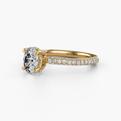 The ring shown above is called the Saskia 2 OVL. We call this type of ring a pavé solitaire ring because it has one centre gemstone and a band that is also pave set with gemstones. The 14 Carat gold engagement ring is set with a oval 0.70 crt diamond centre stone and the band is pave set with lab grown diamond gemstones. Each jewel is made just for you by our master goldsmiths in our own studio.This exclusive gold pavé solitaire engagement ring has an exquisite oval diamond centre stone. To further accentuate the centre stone, the band is fully set with more lab-grown diamonds. Its open prong setting allows light to strike the diamond from various angles and this adds sparkle to your diamond ring. The photo shown above depicts the goldsmith's carefully handcrafted details of the ring. The high positioning of the centre stone is truly eye-catching. The perfect engagement ring for the crown jewel of your life! After receiving your order, our goldsmiths will passionately start the creative process of making your engagement ring in our own studio. Because we don't have a big stockpile, these costs will not be passed on to you. Our pricing is proof of that! We offer top quality jewels at lowest price, guaranteed.Have you found a specific engagement ring somewhere which you would like to give to your loved one? Please feel free to express your wishes to our jewel designers because we would be honoured to turn your design into a exclusive engagement ring. You can follow the development of your ring design because we use 3D drawings. This gives you a realistic preview of how your design will look. You can also preorder a dummy. A dummy is a plastic ring, which can be shaped according your ring design. You can try it on and check if its width and size are suitable for you. We will gladly send you a non-binding offer, based on a fair price/ quality ratio. It will amaze you, considering the quality of the ring and gemstones.To make it easier for you, we offer a 30 day return policy. Check our terms and conditions.