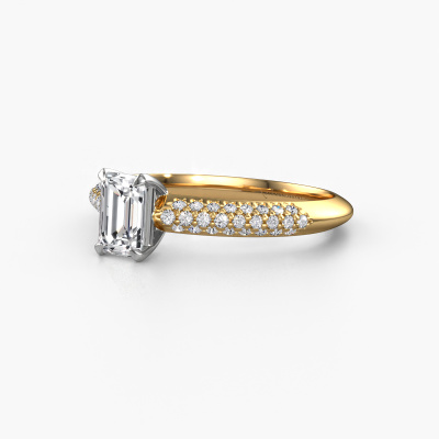 The ring shown above is called the Morane EME. We call this type of ring a pavé solitaire ring because it has one centre gemstone and a band that is also pave set with gemstones. The 14 Carat gold engagement ring is set with a emerald cut 0.70 crt diamond centre stone and the band is pave set with lab grown diamond gemstones. Each jewel is made just for you by our master goldsmiths in our own studio.This unique gold pavé solitaire engagement ring has an exquisite emerald cut diamond centre stone. To further accentuate the centre stone, the band is fully set with more lab-grown diamonds. Its open prong setting allows light to strike the diamond from various angles and this adds sparkle to your diamond ring. The photo shown above depicts the goldsmith's carefully handcrafted details of the ring. The high positioning of the centre stone is truly eye-catching. The perfect engagement ring for the crown jewel of your life! After receiving your order, our goldsmiths will passionately start the creative process of making your engagement ring in our own studio. Because we don't have a big stockpile, these costs will not be passed on to you. Our pricing is proof of that! We offer top quality jewels at lowest price, guaranteed.Our team adds new designs to our online collection daily. Our designers and goldsmiths work together in creating the best design. We strive to offer a diverse collection of jewels. Perhaps you have a specific jewel design in mind. One you came across somewhere. Please contact us for a free consultation. We will make you an offer, based on a fair price/ quality ratio, that will baffle you.To make it easier for you, we offer a 30 day return policy. Check our terms and conditions.