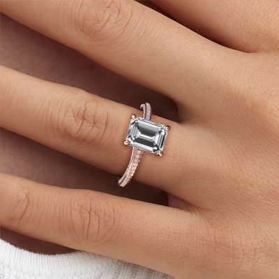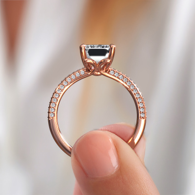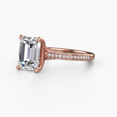 The ring shown above is called the Elenore eme. We call this type of ring a pavé solitaire ring because it has one centre gemstone and a band that is also pave set with gemstones. This engagement ring is made in 14 Carat rose gold set with a 2.50 crt emerald cut diamond, and pave set lab-grown diamonds at the sides. Each piece of jewellery is made just for you, with attention to detail and design.This exclusive rose gold pavé solitaire engagement ring has an exquisite emerald cut diamond centre stone. To further accentuate the centre stone, the band is set full with more lab-grown diamonds. Its open prong setting allows light to strike the diamond from various angles and this adds sparkle to your diamond ring. The photo shown above depicts the goldsmith's carefully handcrafted details of the ring. The high positioning of the centre stone is truly eye-catching. The perfect engagement ring for the crown jewel of your life!Are you on a budget? Please feel free to contact us, so we can go discuss your options. We offer our engagement rings at guaranteed best price, because we make them to order. You won't find such a price anywhere else!Have you found a specific engagement ring somewhere which you would like to give to your loved one? Please feel free to express your wishes to our jewel designers because we would be honoured to turn your design into a exclusive engagement ring. You can follow the development of your ring design because we use 3D drawings. This gives you a realistic preview of how your design will look. You can also preorder a dummy. A dummy is a plastic ring, which can be shaped according your ring design. You can try it on and check if its width and size are suitable for you. We will gladly send you a non-binding offer, based on a fair price/ quality ratio. It will amaze you, considering the quality of the ring and gemstones.To make it easier for you, we offer a 30 day return policy. Check our terms and conditions.