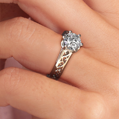 The ring shown above is called the Shan, we call this a solitaire ring because it contains a single gemstone. The engagement ring is made in platinum and has a round diamond of 1.00 crt. The cool thing about our configurator is that you can compile your own piece of jewellery, into a completely personalized one. This solitaire ring is crafted in the precious metals platinum with platinum, but of course you are free to pick your own colours. Each piece of jewellery is made by a team of passionate goldsmiths and jewel designers. This will make your crown jewel truly eye-catching.The solitaire ring is a special type of engagement ring. Its open prong setting allows light to strike the gemstone from various angles. This Celtic engagement ring is a stunning eye-catcher because of the high positioning of the gemstone. In order for you to commemorate your proposal with a unique ring, we carefully adorn this solitaire ring by hand. The love of your life deserves nothing but the best. By using our modern techniques, we can design and customize the finest quality jewels with the utmost care for you. Our engagement rings are always priced 30 percent lower than other jewellers. We make engagement rings to order so we don't have to maintain a large stock. If you have a certain budget, we are more than happy to advice you accordingly.Have you found a specific engagement ring somewhere which you would like to give to your loved one? Please feel free to express your wishes to our jewel designers because we would be honoured to turn your design into a Celtic engagement ring. You can follow the development of your ring design because we use 3D drawings. This gives you a realistic preview of how your design will look. You can also preorder a dummy. A dummy is a plastic ring, which can be shaped according your ring design. You can try it on and check if its width and size are suitable for you. We will gladly send you a non-binding offer, based on a fair price/ quality ratio. It will amaze you, considering the quality of the ring and gemstones.To make it easier for you, we offer a 30 day return policy. Check our terms and conditions.