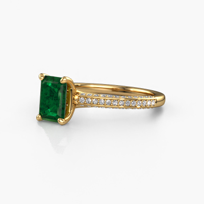The ring shown above is called the Elenore eme. We call this type of ring a pavé solitaire ring because it has one centre gemstone and a band that is also pave set with gemstones. This engagement ring is made in 14 Carat gold set with a 7x5 mm emerald cut emerald, and pave set lab-grown diamonds at the sides. Each piece of jewellery is made just for you, with attention to detail and design.This exclusive gold pavé solitaire engagement ring has an exquisite emerald cut emerald centre stone. To further accentuate the centre stone, the band is set full with more lab-grown diamonds. Its open prong setting allows light to strike the emerald from various angles and this adds sparkle to your emerald ring. The photo shown above depicts the goldsmith's carefully handcrafted details of the ring. The high positioning of the centre stone is truly eye-catching. The perfect engagement ring for the crown jewel of your life!Are you on a budget? Please feel free to contact us, so we can go discuss your options. We offer our engagement rings at guaranteed best price, because we make them to order. You won't find such a price anywhere else!Have you found a specific engagement ring somewhere which you would like to give to your loved one? Please feel free to express your wishes to our jewel designers because we would be honoured to turn your design into a exclusive engagement ring. You can follow the development of your ring design because we use 3D drawings. This gives you a realistic preview of how your design will look. You can also preorder a dummy. A dummy is a plastic ring, which can be shaped according your ring design. You can try it on and check if its width and size are suitable for you. We will gladly send you a non-binding offer, based on a fair price/ quality ratio. It will amaze you, considering the quality of the ring and gemstones.To make it easier for you, we offer a 30 day return policy. Check our terms and conditions.