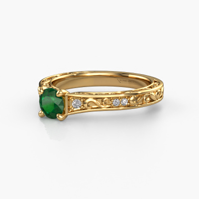 The ring shown above is called the Mallory rnd. We call this type of ring a pavé solitaire ring because it has one centre gemstone and a band that is also pave set with gemstones. This engagement ring is made in 14 Carat gold set with a 5 mm round emerald, and pave set lab-grown diamonds at the sides. Each piece of jewellery is made just for you by our master goldsmiths in our own studio.This vintage gold pavé solitaire engagement ring has an exquisite round emerald centre stone. To further accentuate the centre stone, the band is set full with more lab-grown diamonds. Its open prong setting allows light to strike the emerald from various angles and this adds sparkle to your emerald ring. The photo shown above depicts the goldsmith's carefully handcrafted details of the ring. The high positioning of the centre stone is truly eye-catching. The perfect engagement ring for the crown jewel of your life!Because we design and deliver our own rings, we can offer you a engagement ring at a price you won't find anywhere else. A ring is made to order, which helps prevent excess supplies, so we can make you a great price offer. We understand it feels risky, buying your engagement ring online, but we will gladly assist in the designing process, taking your budget into consideration.Different styles of new rings are made daily by our team. Perhaps you have found a pavé solitaire engagement ring somewhere. One you would like to give to your loved one. Please feel free to share your thoughts and design with our jewel designers. We would love to turn your design into a vintage engagement ring. You can follow the development of your ring design because we use very detailed 3D drawings. On top of that, you can order a dummy of the design. A dummy is a plastic ring, which can be shaped according your ring design. You can try it on and check if the engagement ring is up to standard. We will gladly send you a non-binding offer, based on a fair price/ quality ratio. The offer will baffle you, considering the quality of the ring and gemstones.To make it easier for you, we offer a 30 day return policy. Check our terms and conditions.