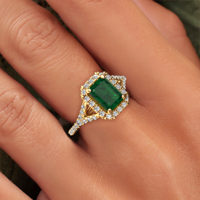 The ring shown above is called the Kimber EME. We call this type of ring a pavé solitaire ring because it has one centre gemstone and a band that is also pave set with gemstones. The 14 Carat gold engagement ring is set with a emerald cut 8x6 mm emerald centre stone and the band is pave set with lab grown diamond gemstones. Each jewel is made by a team of passionate goldsmiths and jewel designers. This will make your crown jewel truly eye-catching.This exclusive gold pavé solitaire engagement ring has an exquisite emerald cut emerald centre stone. To further accentuate the centre stone, the band is fully set with more lab-grown diamonds. Its open prong setting allows light to strike the emerald from various angles and this adds sparkle to your emerald ring. The photo shown above depicts the goldsmith's carefully handcrafted details of the ring. The high positioning of the centre stone is truly eye-catching. The perfect engagement ring for the crown jewel of your life! By using a combination of the latest modern techniques, combined with ancient crafting, we can make all our engagement rings in our own studio. Each jewel is made to order. This is advantageous because we can offer you a price you won't find anywhere else.Our team adds new designs to our online collection daily. Our designers and goldsmiths work together in creating the best design. We strive to offer a diverse collection of jewels. Perhaps you have a specific jewel design in mind. One you came across somewhere. Please contact us for a free consultation. We will make you an offer, based on a fair price/ quality ratio, that will baffle you.To make it easier for you, we offer a 30 day return policy. Check our terms and conditions.