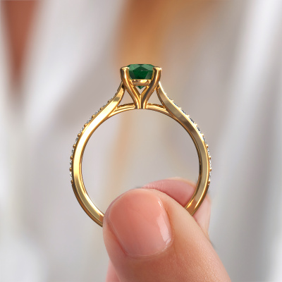 The ring shown above is called the Mignon rnd 2. We call this type of ring a pavé solitaire ring because it has one centre gemstone and a band that is also pave set with gemstones. The 14 Carat gold engagement ring is set with a round 6 mm emerald centre stone and the band is pave set with lab grown diamond gemstones. Each jewel is made by a team of passionate goldsmiths and jewel designers. This will make your crown jewel truly eye-catching.This luxury gold pavé solitaire engagement ring has an exquisite round emerald centre stone. To further accentuate the centre stone, the band is fully set with more lab-grown diamonds. Its open prong setting allows light to strike the emerald from various angles and this adds sparkle to your emerald ring. The photo shown above depicts the goldsmith's carefully handcrafted details of the ring. The high positioning of the centre stone is truly eye-catching. The perfect engagement ring for the crown jewel of your life! By using our modern techniques, we can design and customize the finest quality jewels with the utmost care for you. Our engagement rings are always priced 30 percent lower than other jewellers. We make engagement rings to order so we don't have to maintain a large stock. If you have a certain budget, we are more than happy to advice you accordingly.Different styles of new rings are made daily by our team. Perhaps you have found a pavé solitaire engagement ring somewhere. One you would like to give to your loved one. Please feel free to share your thoughts and design with our jewel designers. We would love to turn your design into a luxury engagement ring. You can follow the development of your ring design because we use very detailed 3D drawings. On top of that, you can order a dummy of the design. A dummy is a plastic ring, which can be shaped according your ring design. You can try it on and check if the engagement ring is up to standard. We will gladly send you a non-binding offer, based on a fair price/ quality ratio. The offer will baffle you, considering the quality of the ring and gemstones.To make it easier for you, we offer a 30 day return policy. Check our terms and conditions.