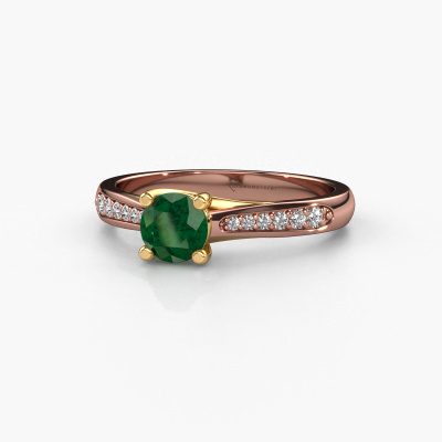 The ring shown above is called the Mia 2. We call this type of ring a pavé solitaire ring because it has one centre gemstone and a band that is also pave set with gemstones. This engagement ring is made in 14 Carat rose gold set with a 5 mm round emerald, and pave set lab-grown diamonds at the sides. Each piece of jewellery is made just for you, with attention to detail and design.This modern rose gold pavé solitaire engagement ring has an exquisite round emerald centre stone. To further accentuate the centre stone, the band is set full with more lab-grown diamonds. Its open prong setting allows light to strike the emerald from various angles and this adds sparkle to your emerald ring. The photo shown above depicts the goldsmith's carefully handcrafted details of the ring. The high positioning of the centre stone is truly eye-catching. The perfect engagement ring for the crown jewel of your life!By using our modern techniques, we can design and customize the finest quality jewels with the utmost care for you. Our engagement rings are always priced 30 percent lower than other jewellers. We make engagement rings to order so we don't have to maintain a large stock. If you have a certain budget, we are more than happy to advice you accordingly.Different styles of new rings are made daily by our team. Perhaps you have found a pavé solitaire engagement ring somewhere. One you would like to give to your loved one. Please feel free to share your thoughts and design with our jewel designers. We would love to turn your design into a modern engagement ring. You can follow the development of your ring design because we use very detailed 3D drawings. On top of that, you can order a dummy of the design. A dummy is a plastic ring, which can be shaped according your ring design. You can try it on and check if the engagement ring is up to standard. We will gladly send you a non-binding offer, based on a fair price/ quality ratio. The offer will baffle you, considering the quality of the ring and gemstones.To make it easier for you, we offer a 30 day return policy. Check our terms and conditions.