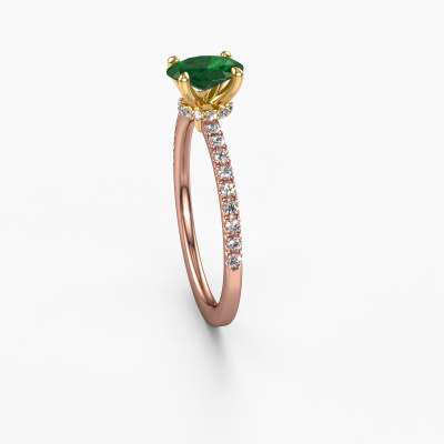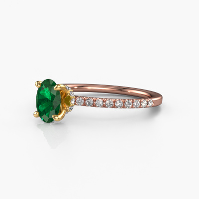 The ring shown above is called the Crystal OVL 4. We call this type of ring a pavé solitaire ring because it has one centre gemstone and a band that is also pave set with gemstones. The 14 Carat rose gold engagement ring is set with a oval 7x5 mm emerald centre stone and the band is pave set with diamond gemstones. Each jewel is made with passion and love by one of our master goldsmiths.This contemporary rose gold pavé solitaire engagement ring has an exquisite oval emerald centre stone. To further accentuate the centre stone, the band is fully set with more diamonds. Its open prong setting allows light to strike the emerald from various angles and this adds sparkle to your emerald ring. The photo shown above depicts the goldsmith's carefully handcrafted details of the ring. The high positioning of the centre stone is truly eye-catching. The perfect engagement ring for the crown jewel of your life! After receiving your order, our goldsmiths will passionately start the creative process of making your engagement ring in our own studio. Because we don't have a big stockpile, these costs will not be passed on to you. Our pricing is proof of that! We offer top quality jewels at lowest price, guaranteed.Our team adds new designs to our online collection daily. Our designers and goldsmiths work together in creating the best design. We strive to offer a diverse collection of jewels. Perhaps you have a specific jewel design in mind. One you came across somewhere. Please contact us for a free consultation. We will make you an offer, based on a fair price/ quality ratio, that will baffle you.To make it easier for you, we offer a 30 day return policy. Check our terms and conditions.