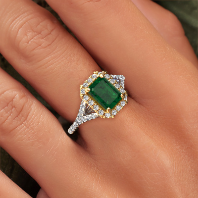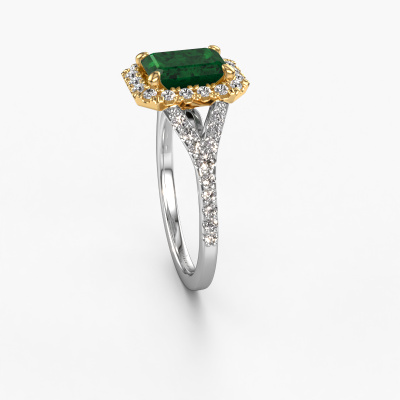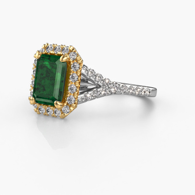 The ring shown above is called the Kimber EME. We call this type of ring a pavé solitaire ring because it has one centre gemstone and a band that is also pave set with gemstones. The 14 Carat white gold engagement ring is set with a emerald cut 8x6 mm emerald centre stone and the band is pave set with lab grown diamond gemstones. Each jewel is made by a team of passionate goldsmiths and jewel designers. This will make your crown jewel truly eye-catching.This exclusive white gold pavé solitaire engagement ring has an exquisite emerald cut emerald centre stone. To further accentuate the centre stone, the band is fully set with more lab-grown diamonds. Its open prong setting allows light to strike the emerald from various angles and this adds sparkle to your emerald ring. The photo shown above depicts the goldsmith's carefully handcrafted details of the ring. The high positioning of the centre stone is truly eye-catching. The perfect engagement ring for the crown jewel of your life! By using a combination of the latest modern techniques, combined with ancient crafting, we can make all our engagement rings in our own studio. Each jewel is made to order. This is advantageous because we can offer you a price you won't find anywhere else.Our team adds new designs to our online collection daily. Our designers and goldsmiths work together in creating the best design. We strive to offer a diverse collection of jewels. Perhaps you have a specific jewel design in mind. One you came across somewhere. Please contact us for a free consultation. We will make you an offer, based on a fair price/ quality ratio, that will baffle you.To make it easier for you, we offer a 30 day return policy. Check our terms and conditions.