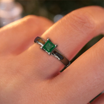 The ring shown above is called the Mia Square, we call this a solitaire ring because it contains a single gemstone. The engagement ring is made in platinum and has a princess emerald of 4 mm. The cool thing about our configurator is that you can compile your own piece of jewellery, into a completely personalized one. This solitaire ring is crafted in the precious metals platinum with platinum, but of course you are free to pick your own colours. Each piece of jewellery is made by a team of passionate goldsmiths and jewel designers. This will make your crown jewel truly eye-catching.The solitaire ring is a special type of engagement ring. Its open prong setting allows light to strike the gemstone from various angles. This modern engagement ring is a stunning eye-catcher because of the high positioning of the gemstone. In order for you to commemorate your proposal with a unique ring, we carefully adorn this solitaire ring by hand. The love of your life deserves nothing but the best. By using our modern techniques, we can design and customize the finest quality jewels with the utmost care for you. Our engagement rings are always priced 30 percent lower than other jewellers. We make engagement rings to order so we don't have to maintain a large stock. If you have a certain budget, we are more than happy to advice you accordingly.Have you found a specific engagement ring somewhere which you would like to give to your loved one? Please feel free to express your wishes to our jewel designers because we would be honoured to turn your design into a modern engagement ring. You can follow the development of your ring design because we use 3D drawings. This gives you a realistic preview of how your design will look. You can also preorder a dummy. A dummy is a plastic ring, which can be shaped according your ring design. You can try it on and check if its width and size are suitable for you. We will gladly send you a non-binding offer, based on a fair price/ quality ratio. It will amaze you, considering the quality of the ring and gemstones.To make it easier for you, we offer a 30 day return policy. Check our terms and conditions.
