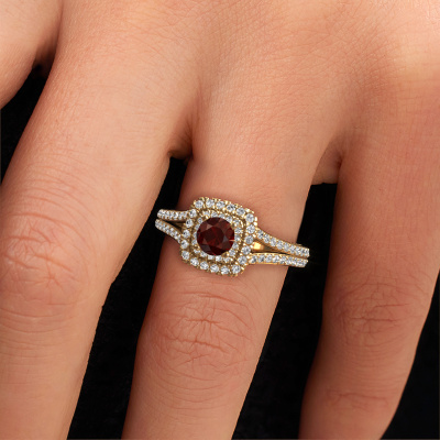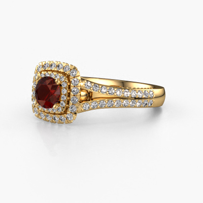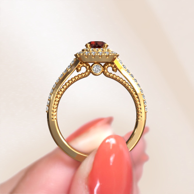 The ring shown above is called the Annette. We call this type of ring a halo ring because it has one centre gemstone and a band that is also pave set with gemstones. The 14 Carat gold engagement ring is set with a round 5 mm garnet centre stone and the band is pave set with diamond gemstones. Each jewel is made just for you by our master goldsmiths in our own studio.This vintage gold halo engagement ring has an exquisite round garnet centre stone. To further accentuate the centre stone, the band is fully set with more diamonds. Its open prong setting allows light to strike the garnet from various angles and this adds sparkle to your garnet ring. The photo shown above depicts the goldsmith's carefully handcrafted details of the ring. The high positioning of the centre stone is truly eye-catching. The perfect engagement ring for the crown jewel of your life! After receiving your order, our goldsmiths will passionately start the creative process of making your engagement ring in our own studio. Because we don't have a big stockpile, these costs will not be passed on to you. Our pricing is proof of that! We offer top quality jewels at lowest price, guaranteed.Have you found a specific engagement ring somewhere which you would like to give to your loved one? Please feel free to express your wishes to our jewel designers because we would be honoured to turn your design into a vintage engagement ring. You can follow the development of your ring design because we use 3D drawings. This gives you a realistic preview of how your design will look. You can also preorder a dummy. A dummy is a plastic ring, which can be shaped according your ring design. You can try it on and check if its width and size are suitable for you. We will gladly send you a non-binding offer, based on a fair price/ quality ratio. It will amaze you, considering the quality of the ring and gemstones.To make it easier for you, we offer a 30 day return policy. Check our terms and conditions.