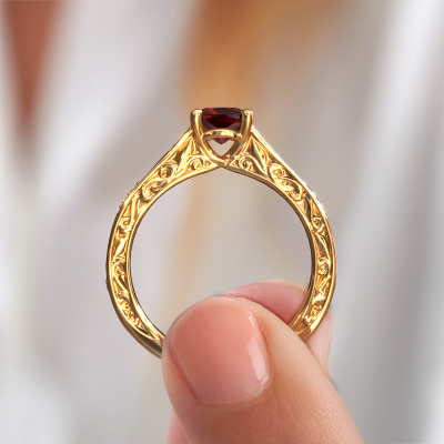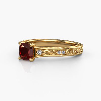 The ring shown above is called the Mallory cus. We call this type of ring a pavé solitaire ring because it has one centre gemstone and a band that is also pave set with gemstones. This engagement ring is made in 14 Carat gold set with a 5.5 mm cushion garnet, and pave set diamonds at the sides. Each piece of jewellery is made just for you by our master goldsmiths in our own studio.This Celtic gold pavé solitaire engagement ring has an exquisite cushion garnet centre stone. To further accentuate the centre stone, the band is set full with more diamonds. Its open prong setting allows light to strike the garnet from various angles and this adds sparkle to your garnet ring. The photo shown above depicts the goldsmith's carefully handcrafted details of the ring. The high positioning of the centre stone is truly eye-catching. The perfect engagement ring for the crown jewel of your life!By using our modern techniques, we can design and customize the finest quality jewels with the utmost care for you. Our engagement rings are always priced 30 percent lower than other jewellers. We make engagement rings to order so we don't have to maintain a large stock. If you have a certain budget, we are more than happy to advice you accordingly.Different styles of new rings are made daily by our team. Perhaps you have found a pavé solitaire engagement ring somewhere. One you would like to give to your loved one. Please feel free to share your thoughts and design with our jewel designers. We would love to turn your design into a Celtic engagement ring. You can follow the development of your ring design because we use very detailed 3D drawings. On top of that, you can order a dummy of the design. A dummy is a plastic ring, which can be shaped according your ring design. You can try it on and check if the engagement ring is up to standard. We will gladly send you a non-binding offer, based on a fair price/ quality ratio. The offer will baffle you, considering the quality of the ring and gemstones.To make it easier for you, we offer a 30 day return policy. Check our terms and conditions.