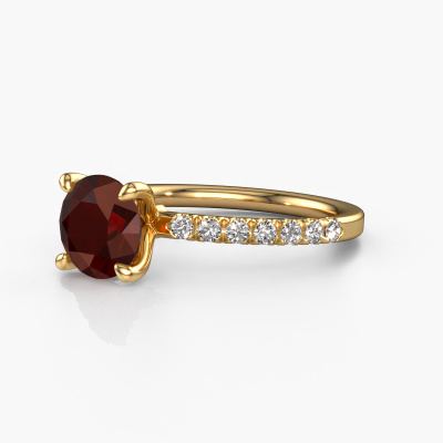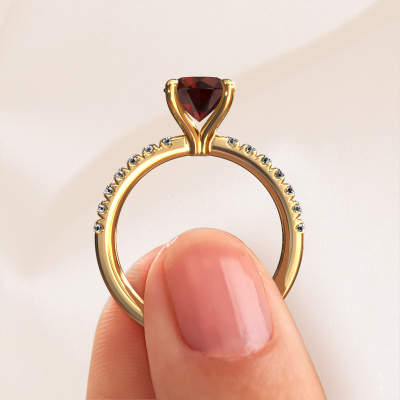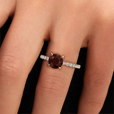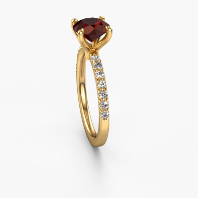 The ring shown above is called the Crystal RND 2. We call this type of ring a pavé solitaire ring because it has one centre gemstone and a band that is also pave set with gemstones. The 14 Carat gold engagement ring is set with a round 7.3 mm garnet centre stone and the band is pave set with lab grown diamond gemstones. Each jewel is unique in every way! Simply customize to your liking,This classic gold pavé solitaire engagement ring has an exquisite round garnet centre stone. To further accentuate the centre stone, the band is fully set with more lab-grown diamonds. Its open prong setting allows light to strike the garnet from various angles and this adds sparkle to your garnet ring. The photo shown above depicts the goldsmith's carefully handcrafted details of the ring. The high positioning of the centre stone is truly eye-catching. The perfect engagement ring for the crown jewel of your life! After receiving your order, our goldsmiths will start the creative process of making your Crystal RND 2 engagement ring. We don't keep stock. This is advantageous because these costs will not be passed on to you. Therefore, we can offer jewellery at exceptionally low prices.Different styles of new rings are made daily by our team. Perhaps you have found a pavé solitaire engagement ring somewhere. One you would like to give to your loved one. Please feel free to share your thoughts and design with our jewel designers. We would love to turn your design into a classic engagement ring. You can follow the development of your ring design because we use very detailed 3D drawings. On top of that, you can order a dummy of the design. A dummy is a plastic ring, which can be shaped according your ring design. You can try it on and check if the engagement ring is up to standard. We will gladly send you a non-binding offer, based on a fair price/ quality ratio. The offer will baffle you, considering the quality of the ring and gemstones.To make it easier for you, we offer a 30 day return policy. Check our terms and conditions.