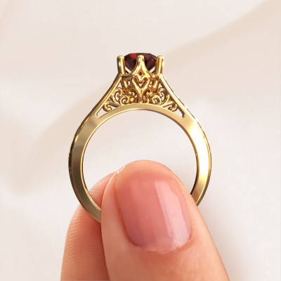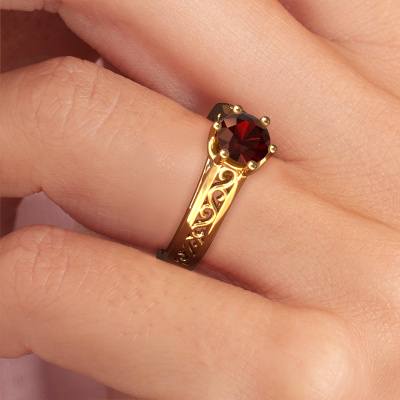 The ring shown above is called the Shan, we call this a solitaire ring because it contains a single gemstone. The engagement ring is made in 14 Carat gold and has a round garnet of 6 mm. The cool thing about our configurator is that you can compile your own piece of jewellery, into a completely personalized one. This solitaire ring is crafted in the precious metals gold with gold, but of course you are free to pick your own colours. Each piece of jewellery is made by a team of passionate goldsmiths and jewel designers. This will make your crown jewel truly eye-catching.The solitaire ring is a special type of engagement ring. Its open prong setting allows light to strike the gemstone from various angles. This Celtic engagement ring is a stunning eye-catcher because of the high positioning of the gemstone. In order for you to commemorate your proposal with a unique ring, we carefully adorn this solitaire ring by hand. The love of your life deserves nothing but the best. By using our modern techniques, we can design and customize the finest quality jewels with the utmost care for you. Our engagement rings are always priced 30 percent lower than other jewellers. We make engagement rings to order so we don't have to maintain a large stock. If you have a certain budget, we are more than happy to advice you accordingly.Have you found a specific engagement ring somewhere which you would like to give to your loved one? Please feel free to express your wishes to our jewel designers because we would be honoured to turn your design into a Celtic engagement ring. You can follow the development of your ring design because we use 3D drawings. This gives you a realistic preview of how your design will look. You can also preorder a dummy. A dummy is a plastic ring, which can be shaped according your ring design. You can try it on and check if its width and size are suitable for you. We will gladly send you a non-binding offer, based on a fair price/ quality ratio. It will amaze you, considering the quality of the ring and gemstones.To make it easier for you, we offer a 30 day return policy. Check our terms and conditions.