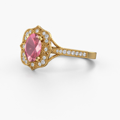 This 14 Carat gold ring is called Loni and is set with 7,5x5,5 mm tourmaline pink. This filigree gold engagement ring is a true work of art! A beautifully adorned design of intricate wires. With dedication, patience and the utmost precision, our expert goldsmith will design a ring just for you. The adornment of small wiring is crafted to perfection by hand. It's a lengthy process which includes welding, crafting and polishing until our Goldsmiths are completely satisfied with the result: a perfect eye-catching ring that makes her shine with delight. Therefore the vintage filigree engagement ring is an extraordinary gift to bestow upon the love of your life. A handmade one-of-a-kind personalized ring, to be given to that special someone on that special moment when you pop the question. Isn't that wonderful? This piece of jewellery is made with passion and love by one of our master goldsmiths.Because we design and deliver our own rings, we can offer you a engagement ring at a price you won't find anywhere else. A ring is made to order, which helps prevent excess supplies, so we can make you a great price offer. We understand it feels risky, buying your engagement ring online, but we will gladly assist in the designing process, taking your budget into consideration.Our team adds new designs to our online collection daily. Our designers and goldsmiths work together in creating the best design. We strive to offer a diverse collection of jewels. Perhaps you have a specific jewel design in mind. One you came across somewhere. Please contact us for a free consultation. We will make you an offer, based on a fair price/ quality ratio, that will baffle you.To make it easier for you, we offer a 30 day return policy. Check our terms and conditions.