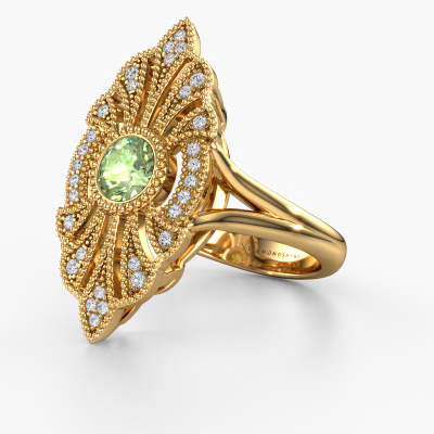 This 14 Carat gold ring is called Hanna and is set with 5 mm green lab grown diamond. This filigree gold engagement ring is a true work of art! A beautifully adorned design of intricate wires. With dedication, patience and the utmost precision, our expert goldsmith will design a ring just for you. The adornment of small wiring is crafted to perfection by hand. It's a lengthy process which includes welding, crafting and polishing until our Goldsmiths are completely satisfied with the result: a perfect eye-catching ring that makes her shine with delight. Therefore the vintage filigree engagement ring is an extraordinary gift to bestow upon the love of your life. A handmade one-of-a-kind personalized ring, to be given to that special someone on that special moment when you pop the question. Isn't that wonderful? This piece of jewellery is created to add sparkle to your finger, each jewel is lovingly made by hand by our goldsmiths.After receiving your order, our goldsmiths will passionately start the creative process of making your engagement ring in our own studio. Because we don't have a big stockpile, these costs will not be passed on to you. Our pricing is proof of that! We offer top quality jewels at lowest price, guaranteed.Our team adds new designs to our online collection daily. Our designers and goldsmiths work together in creating the best design. We strive to offer a diverse collection of jewels. Perhaps you have a specific jewel design in mind. One you came across somewhere. Please contact us for a free consultation. We will make you an offer, based on a fair price/ quality ratio, that will baffle you.To make it easier for you, we offer a 30 day return policy. Check our terms and conditions.