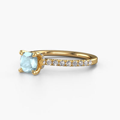 The ring shown above is called the Crystal CUS 4. We call this type of ring a pavé solitaire ring because it has one centre gemstone and a band that is also pave set with gemstones. The 14 Carat gold engagement ring is set with a cushion 5.5 mm aquamarine centre stone and the band is pave set with diamond gemstones. Each jewel is created to add sparkle to your finger, each jewel is lovingly made by hand by our goldsmiths.This chic gold pavé solitaire engagement ring has an exquisite cushion aquamarine centre stone. To further accentuate the centre stone, the band is fully set with more diamonds. Its open prong setting allows light to strike the aquamarine from various angles and this adds sparkle to your aquamarine ring. The photo shown above depicts the goldsmith's carefully handcrafted details of the ring. The high positioning of the centre stone is truly eye-catching. The perfect engagement ring for the crown jewel of your life! By using our modern techniques, we can design and customize the finest quality jewels with the utmost care for you. Our engagement rings are always priced 30 percent lower than other jewellers. We make engagement rings to order so we don't have to maintain a large stock. If you have a certain budget, we are more than happy to advice you accordingly.Do you have a specific ring in mind? One you came across somewhere. Please feel free to tell us your wishes and we will turn your design into a unique engagement ring. You can follow the development of your ring design because we use 3D drawings. This gives you a realistic preview of your design. We will gladly send you a non-binding offer, based on a fair price/ quality ratio. It will amaze you.To make it easier for you, we offer a 30 day return policy. Check our terms and conditions.