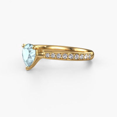 The ring shown above is called the Mignon per 2. We call this type of ring a pavé solitaire ring because it has one centre gemstone and a band that is also pave set with gemstones. The 14 Carat gold engagement ring is set with a pear 6.5x4.5 mm aquamarine centre stone and the band is pave set with diamond gemstones. Each jewel is made just for you by our master goldsmiths in our own studio.This trendy gold pavé solitaire engagement ring has an exquisite pear aquamarine centre stone. To further accentuate the centre stone, the band is fully set with more diamonds. Its open prong setting allows light to strike the aquamarine from various angles and this adds sparkle to your aquamarine ring. The photo shown above depicts the goldsmith's carefully handcrafted details of the ring. The high positioning of the centre stone is truly eye-catching. The perfect engagement ring for the crown jewel of your life! Are you on a budget? Please feel free to contact us, so we can go discuss your options. We offer our engagement rings at guaranteed best price, because we make them to order. You won't find such a price anywhere else!Our team adds new designs to our online collection daily. Our designers and goldsmiths work together in creating the best design. We strive to offer a diverse collection of jewels. Perhaps you have a specific jewel design in mind. One you came across somewhere. Please contact us for a free consultation. We will make you an offer, based on a fair price/ quality ratio, that will baffle you.To make it easier for you, we offer a 30 day return policy. Check our terms and conditions.