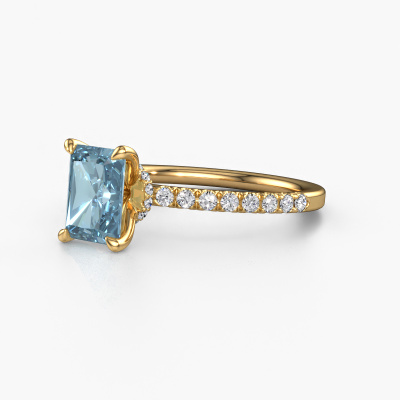 The ring shown above is called the Crystal RAD 4. We call this type of ring a pavé solitaire ring because it has one centre gemstone and a band that is also pave set with gemstones. The 14 Carat gold engagement ring is set with a radiant 7.5x5.5 mm blue lab grown diamond centre stone and the band is pave set with lab grown diamond gemstones. Each jewel is made with passion and love by one of our master goldsmiths.This fashionable gold pavé solitaire engagement ring has an exquisite radiant blue lab grown diamond centre stone. To further accentuate the centre stone, the band is fully set with more lab-grown diamonds. Its open prong setting allows light to strike the blue lab grown diamond from various angles and this adds sparkle to your blue lab grown diamond ring. The photo shown above depicts the goldsmith's carefully handcrafted details of the ring. The high positioning of the centre stone is truly eye-catching. The perfect engagement ring for the crown jewel of your life! After receiving your order, our goldsmiths will passionately start the creative process of making your engagement ring in our own studio. Because we don't have a big stockpile, these costs will not be passed on to you. Our pricing is proof of that! We offer top quality jewels at lowest price, guaranteed.Do you have a specific ring in mind? One you came across somewhere. Please feel free to tell us your wishes and we will turn your design into a unique engagement ring. You can follow the development of your ring design because we use 3D drawings. This gives you a realistic preview of your design. We will gladly send you a non-binding offer, based on a fair price/ quality ratio. It will amaze you.To make it easier for you, we offer a 30 day return policy. Check our terms and conditions.