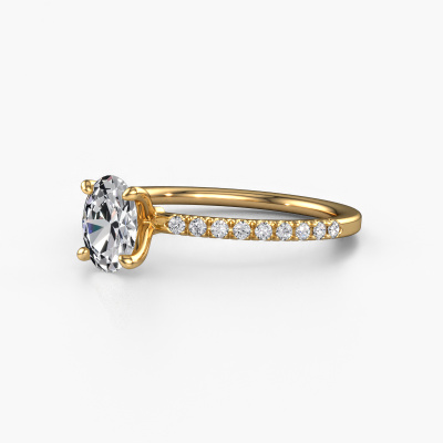 The ring shown above is called the Crystal OVL 2. We call this type of ring a pavé solitaire ring because it has one centre gemstone and a band that is also pave set with gemstones. The 14 Carat gold engagement ring is set with a oval 0.70 crt diamond centre stone and the band is pave set with lab grown diamond gemstones. Each jewel is made just for you by our master goldsmiths in our own studio.This exclusive gold pavé solitaire engagement ring has an exquisite oval diamond centre stone. To further accentuate the centre stone, the band is fully set with more lab-grown diamonds. Its open prong setting allows light to strike the diamond from various angles and this adds sparkle to your diamond ring. The photo shown above depicts the goldsmith's carefully handcrafted details of the ring. The high positioning of the centre stone is truly eye-catching. The perfect engagement ring for the crown jewel of your life! By using a combination of the latest modern techniques, combined with ancient crafting, we can make all our engagement rings in our own studio. Each jewel is made to order. This is advantageous because we can offer you a price you won't find anywhere else.Our team adds new designs to our online collection daily. Our designers and goldsmiths work together in creating the best design. We strive to offer a diverse collection of jewels. Perhaps you have a specific jewel design in mind. One you came across somewhere. Please contact us for a free consultation. We will make you an offer, based on a fair price/ quality ratio, that will baffle you.To make it easier for you, we offer a 30 day return policy. Check our terms and conditions.