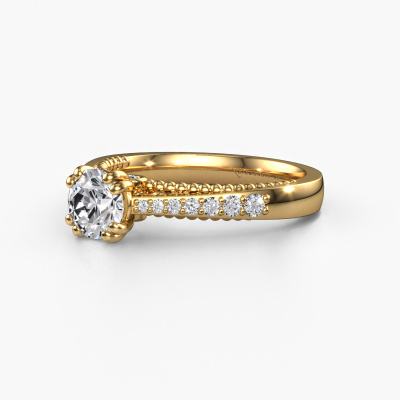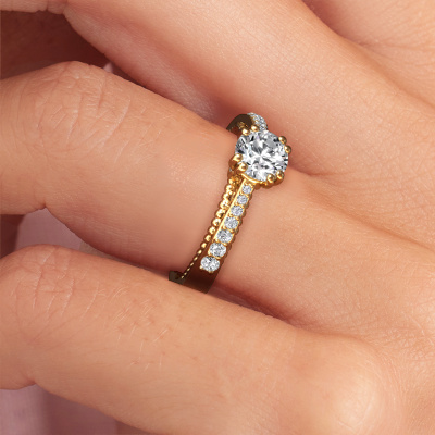 The ring shown above is called the Rozella. We call this type of ring a pavé solitaire ring because it has one centre gemstone and a band that is also pave set with gemstones. The 14 Carat gold engagement ring is set with a round 0.70 crt diamond centre stone and the band is pave set with lab grown diamond gemstones. Each jewel is made to shine bright around your finger. Each jewel is hand made with love by our goldsmiths.This unique gold pavé solitaire engagement ring has an exquisite round diamond centre stone. To further accentuate the centre stone, the band is fully set with more lab-grown diamonds. Its open prong setting allows light to strike the diamond from various angles and this adds sparkle to your diamond ring. The photo shown above depicts the goldsmith's carefully handcrafted details of the ring. The high positioning of the centre stone is truly eye-catching. The perfect engagement ring for the crown jewel of your life! After receiving your order, our goldsmiths will start the creative process of making your Rozella engagement ring. We don't keep stock. This is advantageous because these costs will not be passed on to you. Therefore, we can offer jewellery at exceptionally low prices.Our designers and goldsmiths work together each day, creating new jewels. Perhaps you have found a nice unique engagement ring somewhere, which can be used to customize your unique ring. Please feel free to contact us. We will make you an offer, based on a fair price/ quality ratio, which will amaze you.To make it easier for you, we offer a 30 day return policy. Check our terms and conditions.