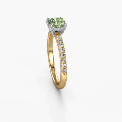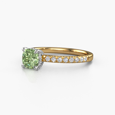 The ring shown above is called the Saskia 1 CUS. We call this type of ring a pavé solitaire ring because it has one centre gemstone and a band that is also pave set with gemstones. The 14 Carat gold engagement ring is set with a cushion 5.5 mm green lab grown diamond centre stone and the band is pave set with diamond gemstones. Each jewel is made by a team of passionate goldsmiths and jewel designers. This will make your crown jewel truly eye-catching.This unique gold pavé solitaire engagement ring has an exquisite cushion green lab grown diamond centre stone. To further accentuate the centre stone, the band is fully set with more diamonds. Its open prong setting allows light to strike the green lab grown diamond from various angles and this adds sparkle to your green lab grown diamond ring. The photo shown above depicts the goldsmith's carefully handcrafted details of the ring. The high positioning of the centre stone is truly eye-catching. The perfect engagement ring for the crown jewel of your life! By using a combination of the latest modern techniques, combined with ancient crafting, we can make all our engagement rings in our own studio. Each jewel is made to order. This is advantageous because we can offer you a price you won't find anywhere else.Our team adds new designs to our online collection daily. Our designers and goldsmiths work together in creating the best design. We strive to offer a diverse collection of jewels. Perhaps you have a specific jewel design in mind. One you came across somewhere. Please contact us for a free consultation. We will make you an offer, based on a fair price/ quality ratio, that will baffle you.To make it easier for you, we offer a 30 day return policy. Check our terms and conditions.