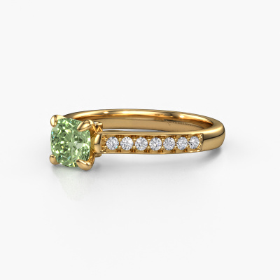 The ring shown above is called the Valorie cus 2. We call this type of ring a pavé solitaire ring because it has one centre gemstone and a band that is also pave set with gemstones. The 14 Carat gold engagement ring is set with a cushion 5.5 mm green lab grown diamond centre stone and the band is pave set with diamond gemstones. Each jewel is made just for you by our master goldsmiths in our own studio.This traditional gold pavé solitaire engagement ring has an exquisite cushion green lab grown diamond centre stone. To further accentuate the centre stone, the band is fully set with more diamonds. Its open prong setting allows light to strike the green lab grown diamond from various angles and this adds sparkle to your green lab grown diamond ring. The photo shown above depicts the goldsmith's carefully handcrafted details of the ring. The high positioning of the centre stone is truly eye-catching. The perfect engagement ring for the crown jewel of your life! By using a combination of the latest modern techniques, combined with ancient crafting, we can make all our engagement rings in our own studio. Each jewel is made to order. This is advantageous because we can offer you a price you won't find anywhere else.Our designers and goldsmiths work together each day, creating new jewels. Perhaps you have found a nice traditional engagement ring somewhere, which can be used to customize your unique ring. Please feel free to contact us. We will make you an offer, based on a fair price/ quality ratio, which will amaze you.To make it easier for you, we offer a 30 day return policy. Check our terms and conditions.