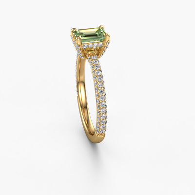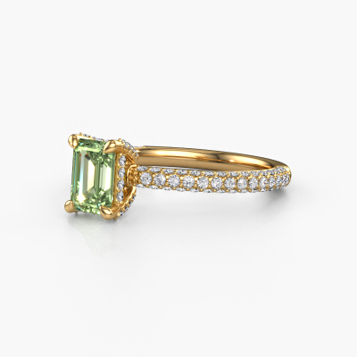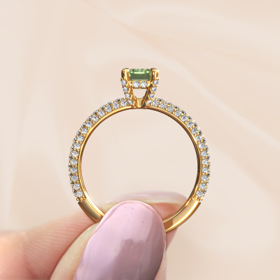 The ring shown above is called the Saskia EME 2. We call this type of ring a pavé solitaire ring because it has one centre gemstone and a band that is also pave set with gemstones. The 14 Carat gold engagement ring is set with a emerald cut 6.5x4.5 mm green lab grown diamond centre stone and the band is pave set with diamond gemstones. Each jewel is made by a team of passionate goldsmiths and jewel designers. This will make your crown jewel truly eye-catching.This exclusive gold pavé solitaire engagement ring has an exquisite emerald cut green lab grown diamond centre stone. To further accentuate the centre stone, the band is fully set with more diamonds. Its open prong setting allows light to strike the green lab grown diamond from various angles and this adds sparkle to your green lab grown diamond ring. The photo shown above depicts the goldsmith's carefully handcrafted details of the ring. The high positioning of the centre stone is truly eye-catching. The perfect engagement ring for the crown jewel of your life! By using our modern techniques, we can design and customize the finest quality jewels with the utmost care for you. Our engagement rings are always priced 30 percent lower than other jewellers. We make engagement rings to order so we don't have to maintain a large stock. If you have a certain budget, we are more than happy to advice you accordingly.Different styles of new rings are made daily by our team. Perhaps you have found a pavé solitaire engagement ring somewhere. One you would like to give to your loved one. Please feel free to share your thoughts and design with our jewel designers. We would love to turn your design into a exclusive engagement ring. You can follow the development of your ring design because we use very detailed 3D drawings. On top of that, you can order a dummy of the design. A dummy is a plastic ring, which can be shaped according your ring design. You can try it on and check if the engagement ring is up to standard. We will gladly send you a non-binding offer, based on a fair price/ quality ratio. The offer will baffle you, considering the quality of the ring and gemstones.To make it easier for you, we offer a 30 day return policy. Check our terms and conditions.