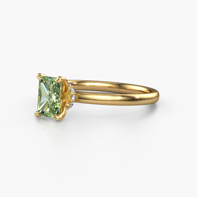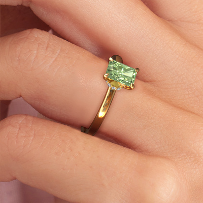 The ring shown above is called the Crystal RAD 3. We call this type of ring a solitaire ring because it has one centre gemstone and a band that is also pave set with gemstones. The 14 Carat gold engagement ring is set with a radiant 6.5x4.5 mm green lab grown diamond centre stone and the band is pave set with diamond gemstones. Each jewel is made just for you by our master goldsmiths in our own studio.This classic gold solitaire engagement ring has an exquisite radiant green lab grown diamond centre stone. To further accentuate the centre stone, the band is fully set with more diamonds. Its open prong setting allows light to strike the green lab grown diamond from various angles and this adds sparkle to your green lab grown diamond ring. The photo shown above depicts the goldsmith's carefully handcrafted details of the ring. The high positioning of the centre stone is truly eye-catching. The perfect engagement ring for the crown jewel of your life! Are you on a budget? Please feel free to contact us, so we can go discuss your options. We offer our engagement rings at guaranteed best price, because we make them to order. You won't find such a price anywhere else!Have you found a specific engagement ring somewhere which you would like to give to your loved one? Please feel free to express your wishes to our jewel designers because we would be honoured to turn your design into a classic engagement ring. You can follow the development of your ring design because we use 3D drawings. This gives you a realistic preview of how your design will look. You can also preorder a dummy. A dummy is a plastic ring, which can be shaped according your ring design. You can try it on and check if its width and size are suitable for you. We will gladly send you a non-binding offer, based on a fair price/ quality ratio. It will amaze you, considering the quality of the ring and gemstones.To make it easier for you, we offer a 30 day return policy. Check our terms and conditions.