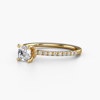 The ring shown above is called the Crystal CUS 4. We call this type of ring a pavé solitaire ring because it has one centre gemstone and a band that is also pave set with gemstones. The 14 Carat gold engagement ring is set with a cushion 0.70 crt lab grown diamond centre stone and the band is pave set with diamond gemstones. Each jewel is created to add sparkle to your finger, each jewel is lovingly made by hand by our goldsmiths.This chic gold pavé solitaire engagement ring has an exquisite cushion lab grown diamond centre stone. To further accentuate the centre stone, the band is fully set with more diamonds. Its open prong setting allows light to strike the lab grown diamond from various angles and this adds sparkle to your lab grown diamond ring. The photo shown above depicts the goldsmith's carefully handcrafted details of the ring. The high positioning of the centre stone is truly eye-catching. The perfect engagement ring for the crown jewel of your life! By using our modern techniques, we can design and customize the finest quality jewels with the utmost care for you. Our engagement rings are always priced 30 percent lower than other jewellers. We make engagement rings to order so we don't have to maintain a large stock. If you have a certain budget, we are more than happy to advice you accordingly.Do you have a specific ring in mind? One you came across somewhere. Please feel free to tell us your wishes and we will turn your design into a unique engagement ring. You can follow the development of your ring design because we use 3D drawings. This gives you a realistic preview of your design. We will gladly send you a non-binding offer, based on a fair price/ quality ratio. It will amaze you.To make it easier for you, we offer a 30 day return policy. Check our terms and conditions.