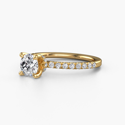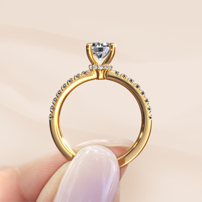 The ring shown above is called the Crystal rnd 4. We call this type of ring a pavé solitaire ring because it has one centre gemstone and a band that is also pave set with gemstones. The 14 Carat gold engagement ring is set with a round 0.70 crt lab grown diamond centre stone and the band is pave set with lab grown diamond gemstones. Each jewel is made to shine bright around your finger. Each jewel is hand made with love by our goldsmiths.This fantasy gold pavé solitaire engagement ring has an exquisite round lab grown diamond centre stone. To further accentuate the centre stone, the band is fully set with more lab-grown diamonds. Its open prong setting allows light to strike the lab grown diamond from various angles and this adds sparkle to your lab grown diamond ring. The photo shown above depicts the goldsmith's carefully handcrafted details of the ring. The high positioning of the centre stone is truly eye-catching. The perfect engagement ring for the crown jewel of your life! By using our modern techniques, we can design and customize the finest quality jewels with the utmost care for you. Our engagement rings are always priced 30 percent lower than other jewellers. We make engagement rings to order so we don't have to maintain a large stock. If you have a certain budget, we are more than happy to advice you accordingly.Have you found a specific engagement ring somewhere which you would like to give to your loved one? Please feel free to express your wishes to our jewel designers because we would be honoured to turn your design into a fantasy engagement ring. You can follow the development of your ring design because we use 3D drawings. This gives you a realistic preview of how your design will look. You can also preorder a dummy. A dummy is a plastic ring, which can be shaped according your ring design. You can try it on and check if its width and size are suitable for you. We will gladly send you a non-binding offer, based on a fair price/ quality ratio. It will amaze you, considering the quality of the ring and gemstones.To make it easier for you, we offer a 30 day return policy. Check our terms and conditions.