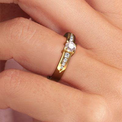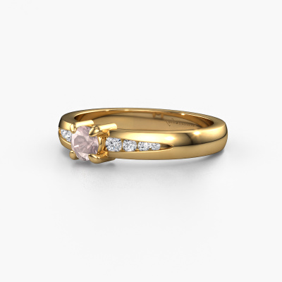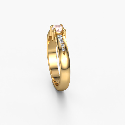 The ring shown above is called the Zohra. We call this type of ring a pavé solitaire ring because it has one centre gemstone and a band that is also pave set with gemstones. The 14 Carat gold engagement ring is set with a round 4 mm morganite champagne centre stone and the band is pave set with diamond gemstones. Each jewel is made just for you by our master goldsmiths in our own studio.This modern gold pavé solitaire engagement ring has an exquisite round morganite champagne centre stone. To further accentuate the centre stone, the band is fully set with more diamonds. Its open prong setting allows light to strike the morganite champagne from various angles and this adds sparkle to your morganite champagne ring. The photo shown above depicts the goldsmith's carefully handcrafted details of the ring. The high positioning of the centre stone is truly eye-catching. The perfect engagement ring for the crown jewel of your life! Because we design and deliver our own rings, we can offer you a engagement ring at a price you won't find anywhere else. A ring is made to order, which helps prevent excess supplies, so we can make you a great price offer. We understand it feels risky, buying your engagement ring online, but we will gladly assist in the designing process, taking your budget into consideration.Our team adds new designs to our online collection daily. Our designers and goldsmiths work together in creating the best design. We strive to offer a diverse collection of jewels. Perhaps you have a specific jewel design in mind. One you came across somewhere. Please contact us for a free consultation. We will make you an offer, based on a fair price/ quality ratio, that will baffle you.To make it easier for you, we offer a 30 day return policy. Check our terms and conditions.