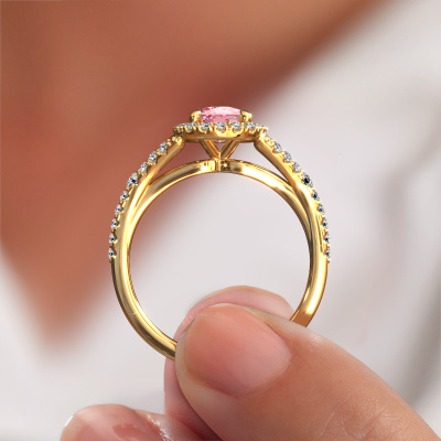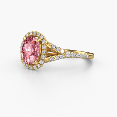 The ring shown above is called the Kimber CSH. We call this type of ring a pavé solitaire ring because it has one centre gemstone and a band that is also pave set with gemstones. The 14 Carat gold engagement ring is set with a cushion rectangle 7.4x5.8 mm pink lab grown diamond centre stone and the band is pave set with lab grown diamond gemstones. Each jewel is made just for you by our master goldsmiths in our own studio.This classic gold pavé solitaire engagement ring has an exquisite cushion rectangle pink lab grown diamond centre stone. To further accentuate the centre stone, the band is fully set with more lab-grown diamonds. Its open prong setting allows light to strike the pink lab grown diamond from various angles and this adds sparkle to your pink lab grown diamond ring. The photo shown above depicts the goldsmith's carefully handcrafted details of the ring. The high positioning of the centre stone is truly eye-catching. The perfect engagement ring for the crown jewel of your life! Because we design and deliver our own rings, we can offer you a engagement ring at a price you won't find anywhere else. A ring is made to order, which helps prevent excess supplies, so we can make you a great price offer. We understand it feels risky, buying your engagement ring online, but we will gladly assist in the designing process, taking your budget into consideration.Our designers and goldsmiths work together each day, creating new jewels. Perhaps you have found a nice classic engagement ring somewhere, which can be used to customize your unique ring. Please feel free to contact us. We will make you an offer, based on a fair price/ quality ratio, which will amaze you.To make it easier for you, we offer a 30 day return policy. Check our terms and conditions.