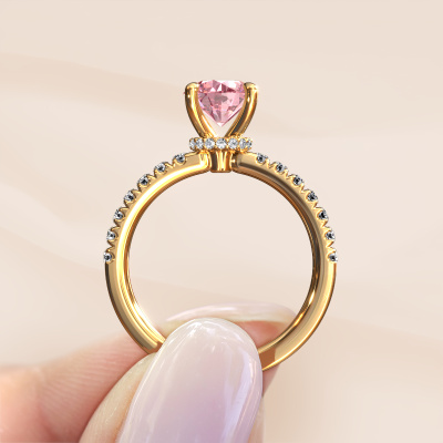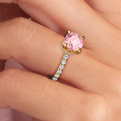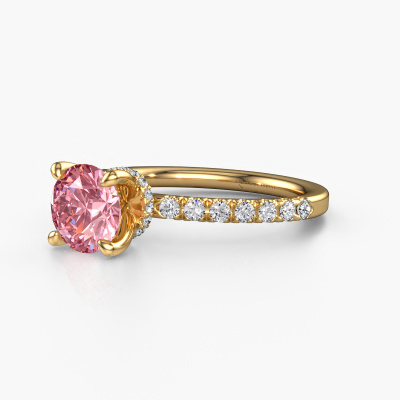 The ring shown above is called the Crystal rnd 4. We call this type of ring a pavé solitaire ring because it has one centre gemstone and a band that is also pave set with gemstones. The 14 Carat gold engagement ring is set with a round 7 mm pink lab grown diamond centre stone and the band is pave set with lab grown diamond gemstones. Each jewel is made to shine bright around your finger. Each jewel is hand made with love by our goldsmiths.This fantasy gold pavé solitaire engagement ring has an exquisite round pink lab grown diamond centre stone. To further accentuate the centre stone, the band is fully set with more lab-grown diamonds. Its open prong setting allows light to strike the pink lab grown diamond from various angles and this adds sparkle to your pink lab grown diamond ring. The photo shown above depicts the goldsmith's carefully handcrafted details of the ring. The high positioning of the centre stone is truly eye-catching. The perfect engagement ring for the crown jewel of your life! By using our modern techniques, we can design and customize the finest quality jewels with the utmost care for you. Our engagement rings are always priced 30 percent lower than other jewellers. We make engagement rings to order so we don't have to maintain a large stock. If you have a certain budget, we are more than happy to advice you accordingly.Have you found a specific engagement ring somewhere which you would like to give to your loved one? Please feel free to express your wishes to our jewel designers because we would be honoured to turn your design into a fantasy engagement ring. You can follow the development of your ring design because we use 3D drawings. This gives you a realistic preview of how your design will look. You can also preorder a dummy. A dummy is a plastic ring, which can be shaped according your ring design. You can try it on and check if its width and size are suitable for you. We will gladly send you a non-binding offer, based on a fair price/ quality ratio. It will amaze you, considering the quality of the ring and gemstones.To make it easier for you, we offer a 30 day return policy. Check our terms and conditions.