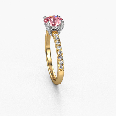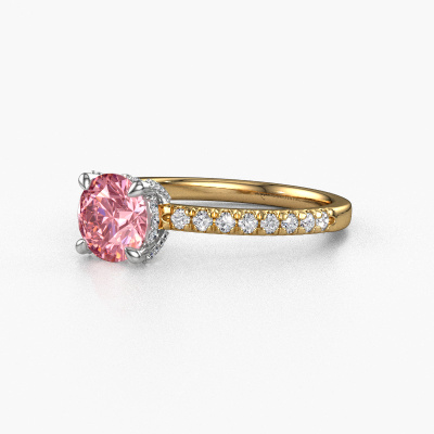 The ring shown above is called the Saskia rnd 1. We call this type of ring a pavé solitaire ring because it has one centre gemstone and a band that is also pave set with gemstones. The 14 Carat gold engagement ring is set with a round 6.5 mm pink lab grown diamond centre stone and the band is pave set with lab grown diamond gemstones. Each jewel is made with passion and love by one of our master goldsmiths.This exclusive gold pavé solitaire engagement ring has an exquisite round pink lab grown diamond centre stone. To further accentuate the centre stone, the band is fully set with more lab-grown diamonds. Its open prong setting allows light to strike the pink lab grown diamond from various angles and this adds sparkle to your pink lab grown diamond ring. The photo shown above depicts the goldsmith's carefully handcrafted details of the ring. The high positioning of the centre stone is truly eye-catching. The perfect engagement ring for the crown jewel of your life! By using a combination of the latest modern techniques, combined with ancient crafting, we can make all our engagement rings in our own studio. Each jewel is made to order. This is advantageous because we can offer you a price you won't find anywhere else.Do you have a specific ring in mind? One you came across somewhere. Please feel free to tell us your wishes and we will turn your design into a unique engagement ring. You can follow the development of your ring design because we use 3D drawings. This gives you a realistic preview of your design. We will gladly send you a non-binding offer, based on a fair price/ quality ratio. It will amaze you.To make it easier for you, we offer a 30 day return policy. Check our terms and conditions.