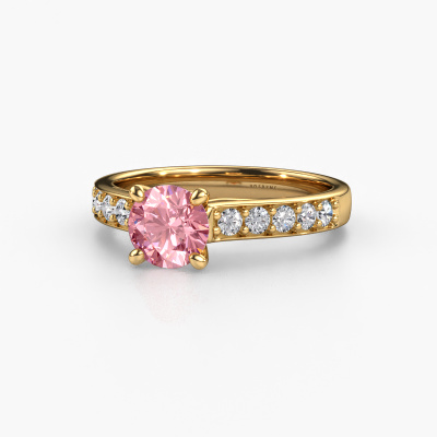 The ring shown above is called the Valorie RND 2. We call this type of ring a pavé solitaire ring because it has one centre gemstone and a band that is also pave set with gemstones. The 14 Carat gold engagement ring is set with a round 6.5 mm pink lab grown diamond centre stone and the band is pave set with lab grown diamond gemstones. Each jewel is made just for you, with attention to detail and design.This modern gold pavé solitaire engagement ring has an exquisite round pink lab grown diamond centre stone. To further accentuate the centre stone, the band is fully set with more lab-grown diamonds. Its open prong setting allows light to strike the pink lab grown diamond from various angles and this adds sparkle to your pink lab grown diamond ring. The photo shown above depicts the goldsmith's carefully handcrafted details of the ring. The high positioning of the centre stone is truly eye-catching. The perfect engagement ring for the crown jewel of your life! By using our modern techniques, we can design and customize the finest quality jewels with the utmost care for you. Our engagement rings are always priced 30 percent lower than other jewellers. We make engagement rings to order so we don't have to maintain a large stock. If you have a certain budget, we are more than happy to advice you accordingly.Our designers and goldsmiths work together each day, creating new jewels. Perhaps you have found a nice modern engagement ring somewhere, which can be used to customize your unique ring. Please feel free to contact us. We will make you an offer, based on a fair price/ quality ratio, which will amaze you.To make it easier for you, we offer a 30 day return policy. Check our terms and conditions.