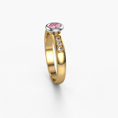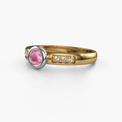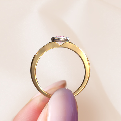 The ring shown above is called the Lieke. We call this type of ring a pavé solitaire ring because it has one centre gemstone and a band that is also pave set with gemstones. The 14 Carat gold engagement ring is set with a round 4 mm pink sapphire centre stone and the band is pave set with diamond gemstones. Each jewel is unique in every way! Simply customize to your likingThis classic gold pavé solitaire engagement ring has an exquisite round pink sapphire centre stone. To further accentuate the centre stone, the band is fully set with more diamonds. Its open prong setting allows light to strike the pink sapphire from various angles and this adds sparkle to your pink sapphire ring. The photo shown above depicts the goldsmith's carefully handcrafted details of the ring. The high positioning of the centre stone is truly eye-catching. The perfect engagement ring for the crown jewel of your life! By using a combination of the latest modern techniques, combined with ancient crafting, we can make all our engagement rings in our own studio. Each jewel is made to order. This is advantageous because we can offer you a price you won't find anywhere else.Different styles of new rings are made daily by our team. Perhaps you have found a pavé solitaire engagement ring somewhere. One you would like to give to your loved one. Please feel free to share your thoughts and design with our jewel designers. We would love to turn your design into a classic engagement ring. You can follow the development of your ring design because we use very detailed 3D drawings. On top of that, you can order a dummy of the design. A dummy is a plastic ring, which can be shaped according your ring design. You can try it on and check if the engagement ring is up to standard. We will gladly send you a non-binding offer, based on a fair price/ quality ratio. The offer will baffle you, considering the quality of the ring and gemstones.To make it easier for you, we offer a 30 day return policy. Check our terms and conditions.