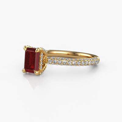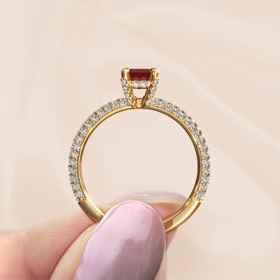 The ring shown above is called the Saskia eme 2. We call this type of ring a pavé solitaire ring because it has one centre gemstone and a band that is also pave set with gemstones. The 14 Carat gold engagement ring is set with a emerald cut 6.5x4.5 mm ruby centre stone and the band is pave set with diamond gemstones. Each jewel is made by a team of passionate goldsmiths and jewel designers. This will make your crown jewel truly eye-catching.This exclusive gold pavé solitaire engagement ring has an exquisite emerald cut ruby centre stone. To further accentuate the centre stone, the band is fully set with more diamonds. Its open prong setting allows light to strike the ruby from various angles and this adds sparkle to your ruby ring. The photo shown above depicts the goldsmith's carefully handcrafted details of the ring. The high positioning of the centre stone is truly eye-catching. The perfect engagement ring for the crown jewel of your life! By using our modern techniques, we can design and customize the finest quality jewels with the utmost care for you. Our engagement rings are always priced 30 percent lower than other jewellers. We make engagement rings to order so we don't have to maintain a large stock. If you have a certain budget, we are more than happy to advice you accordingly.Different styles of new rings are made daily by our team. Perhaps you have found a pavé solitaire engagement ring somewhere. One you would like to give to your loved one. Please feel free to share your thoughts and design with our jewel designers. We would love to turn your design into a exclusive engagement ring. You can follow the development of your ring design because we use very detailed 3D drawings. On top of that, you can order a dummy of the design. A dummy is a plastic ring, which can be shaped according your ring design. You can try it on and check if the engagement ring is up to standard. We will gladly send you a non-binding offer, based on a fair price/ quality ratio. The offer will baffle you, considering the quality of the ring and gemstones.To make it easier for you, we offer a 30 day return policy. Check our terms and conditions.