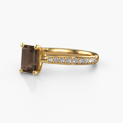The ring shown above is called the Mignon eme 2. We call this type of ring a pavé solitaire ring because it has one centre gemstone and a band that is also pave set with gemstones. The 14 Carat gold engagement ring is set with a emerald cut 7x5 mm smokey quartz centre stone and the band is pave set with lab grown diamond gemstones. Each jewel is made just for you, with attention to detail and design.This exclusive gold pavé solitaire engagement ring has an exquisite emerald cut smokey quartz centre stone. To further accentuate the centre stone, the band is fully set with more lab-grown diamonds. Its open prong setting allows light to strike the smokey quartz from various angles and this adds sparkle to your smokey quartz ring. The photo shown above depicts the goldsmith's carefully handcrafted details of the ring. The high positioning of the centre stone is truly eye-catching. The perfect engagement ring for the crown jewel of your life! Are you on a budget? Please feel free to contact us, so we can go discuss your options. We offer our engagement rings at guaranteed best price, because we make them to order. You won't find such a price anywhere else!Do you have a specific ring in mind? One you came across somewhere. Please feel free to tell us your wishes and we will turn your design into a unique engagement ring. You can follow the development of your ring design because we use 3D drawings. This gives you a realistic preview of your design. We will gladly send you a non-binding offer, based on a fair price/ quality ratio. It will amaze you.To make it easier for you, we offer a 30 day return policy. Check our terms and conditions.